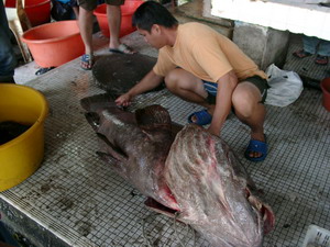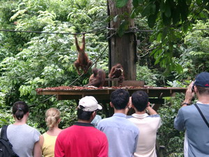 Orang Utan Sepilok / Proboscis Monkeys KinabatanganDay 4 Wed Sepilok Orang Utan & Kinabatangan Proboscis: We visit the vibrant fish market with it's wide variety of marine creatures. After an early lunch, we proceed to Sepilok Orang Utan Santuary 25km 40min for a short walk and to catch the 3pm orang utan feeding time. Within the same premise, there is also a Sumatran Rhino breeding program, open for public viewing. There are only 3 such breeding program for Sumatran/Javan rhinos in the world. We move on to Batu Putih 100km 1.5 hr for a evening boat cruise/safari along the famed Sg Kinabatangan and its proboscis monkeys and other wildlife. We sleep and eat with the local villagers in this WWF sponsored project called Mescot (Model Ecologically Sustainable Community Tourism Project), a home-stay. Note that accommodation and meals here are quite basic and members will be placed in different homes. Dinner and breakfast are included. Suggest to bring BINOCULARS for sighting proboscis.